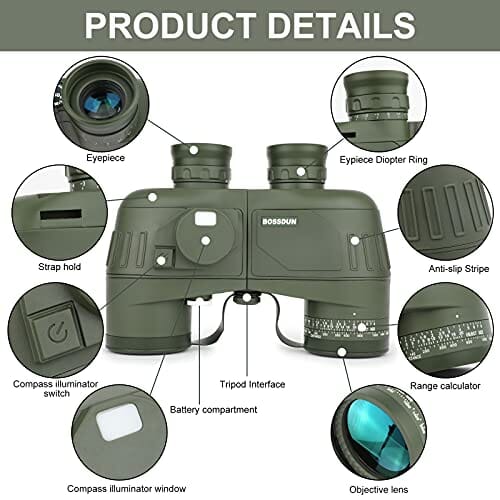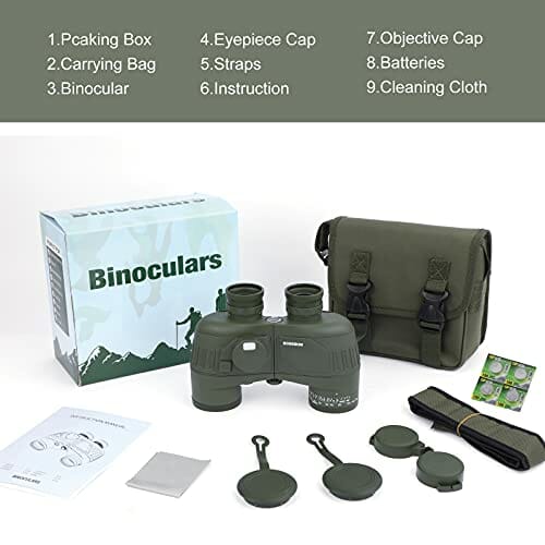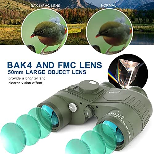 Lornetka 10 x 50 IPX7 wodoodporna lornetka morska do łodzi z podświetlanym dalmierz i kompasem obserwacji ptaków podróż polowanie piłka nożna-soczewka BAK4 pryzmat FMC – etui i pasek dla dorosłych (zi