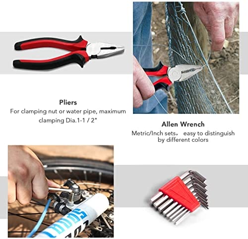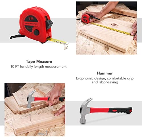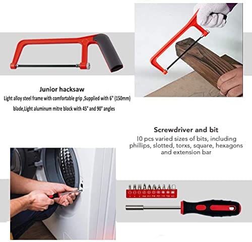 • Zestaw narzędzi domowych – nasze zestawy narzędzi obejmują nóż uniwersalny, rękawice, nożyczki, zestaw asortymentowy, piłę, młotek do pazurów, taśma miernicza 3M, długopis elektryczny, szczypce kombi, taśma izolacyjna 12 m, śrubokręt, uchwyt do wkrętarki, klucz imbusowy (2-6 mm), precyzyjne śrubokręty, zawiera wszystkie przydatne i niezbędne narzędzia do konserwacji w domu. do codziennego użytku