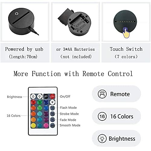 • 4. (Kolor wielokolorowy) – W pełni konfigurowalny kolor za pomocą pilota z 16 kolorami zmieniającymi się. i dotykowy przełącznik konfigurowalny wyświetlacz 7 kolorów jako obraz, zasilany przez 3 * baterie AA lub połączenie USB;