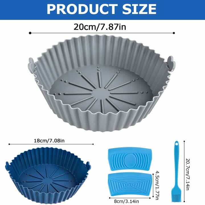 - 【Geeignete Größe】Es umfasst 2-Silikonform für Heißluftfritteuse in verschiedenen Farben, 2-Anti-Verbrühungs-Handclips und eine Silikonbürste. Die Luftfritteuse silikon topf hat einen Durchmesser von 18cm oben, 14,5cm unten und 4,5cm in der Höhe. Geeignet für 3,8L-5L Air Friteuse.