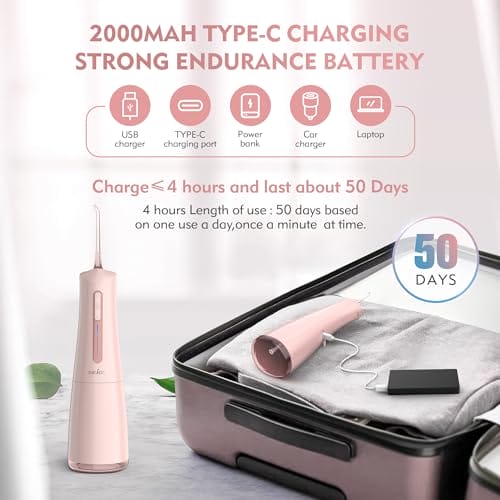 • 【50 dni użytkowania】 ① Akumulatorowa irygator do wody z akumulatorem USB z dużą baterią 2000 mAh wytrzyma do 50 dni ciągłego użytkowania po jednym pełnym naładowaniu, jeśli używasz go raz dziennie przez minutę. ②. Wyposażony w uniwersalny kabel USB typu C, jest wygodny w podróży, bez konieczności ładowania.