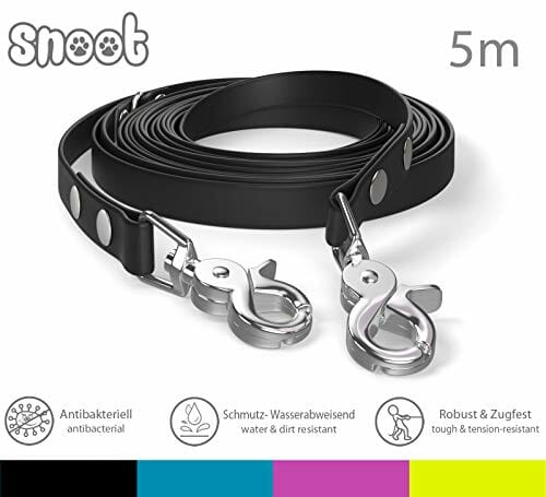 Smycz 5 m, smycz dla psa, 2 karabińczyki i pierścień D, czarna, bardzo stabilna, odporna na zabrudzenia i działanie wody