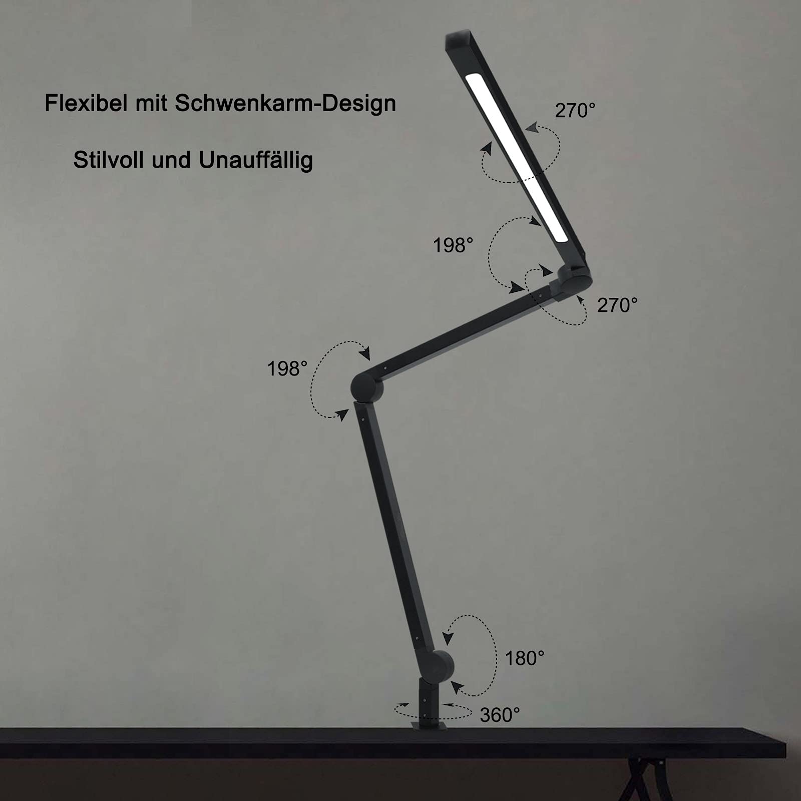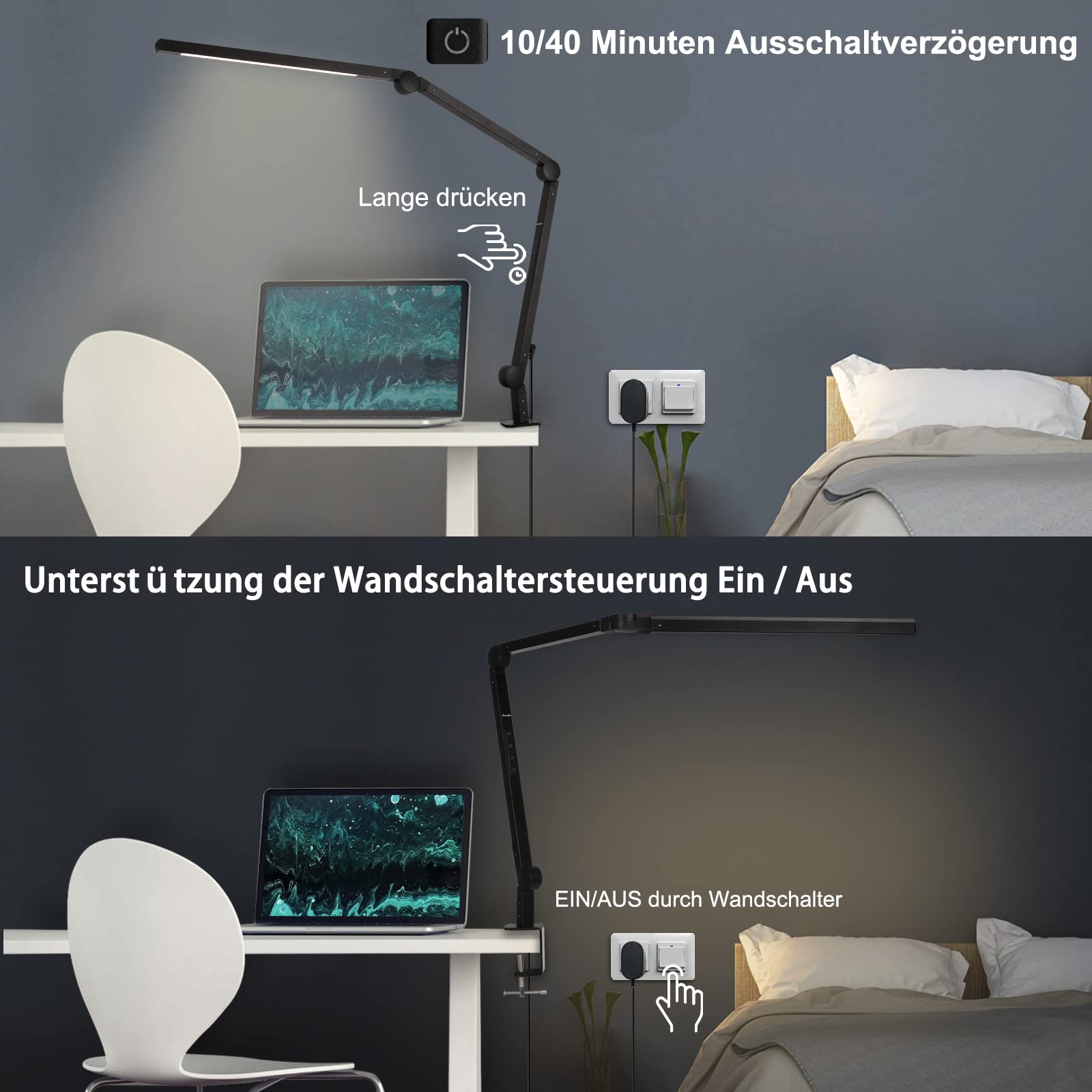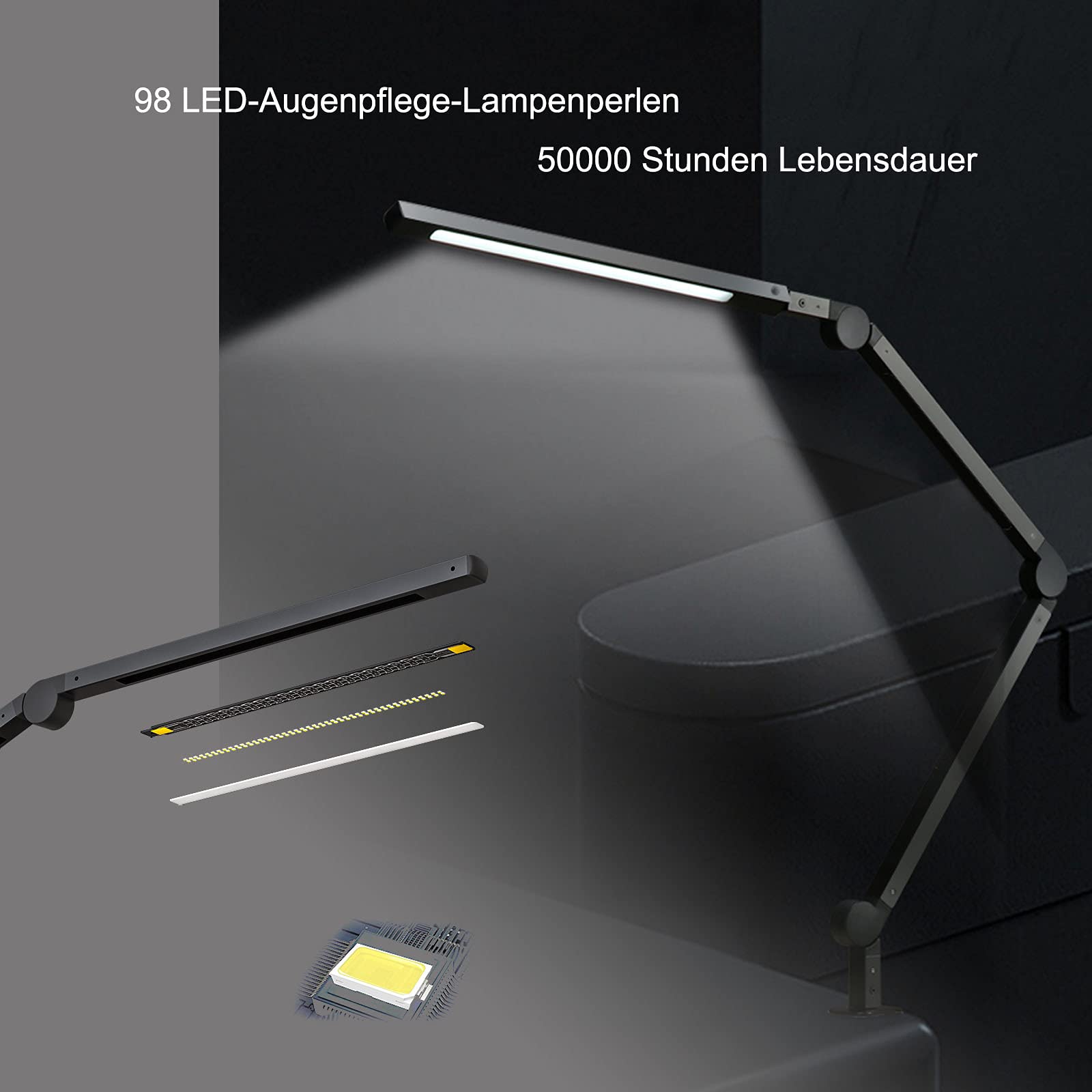 AmazLit lampa biurkowa LED, 10 W, ochrona oczu, zaciskowa, lampa stołowa, ramię wychylne, bezstopniowa regulacja przyciemniania i temperatury barwowej, do biura, domu, sterowanie dotykowe, timing