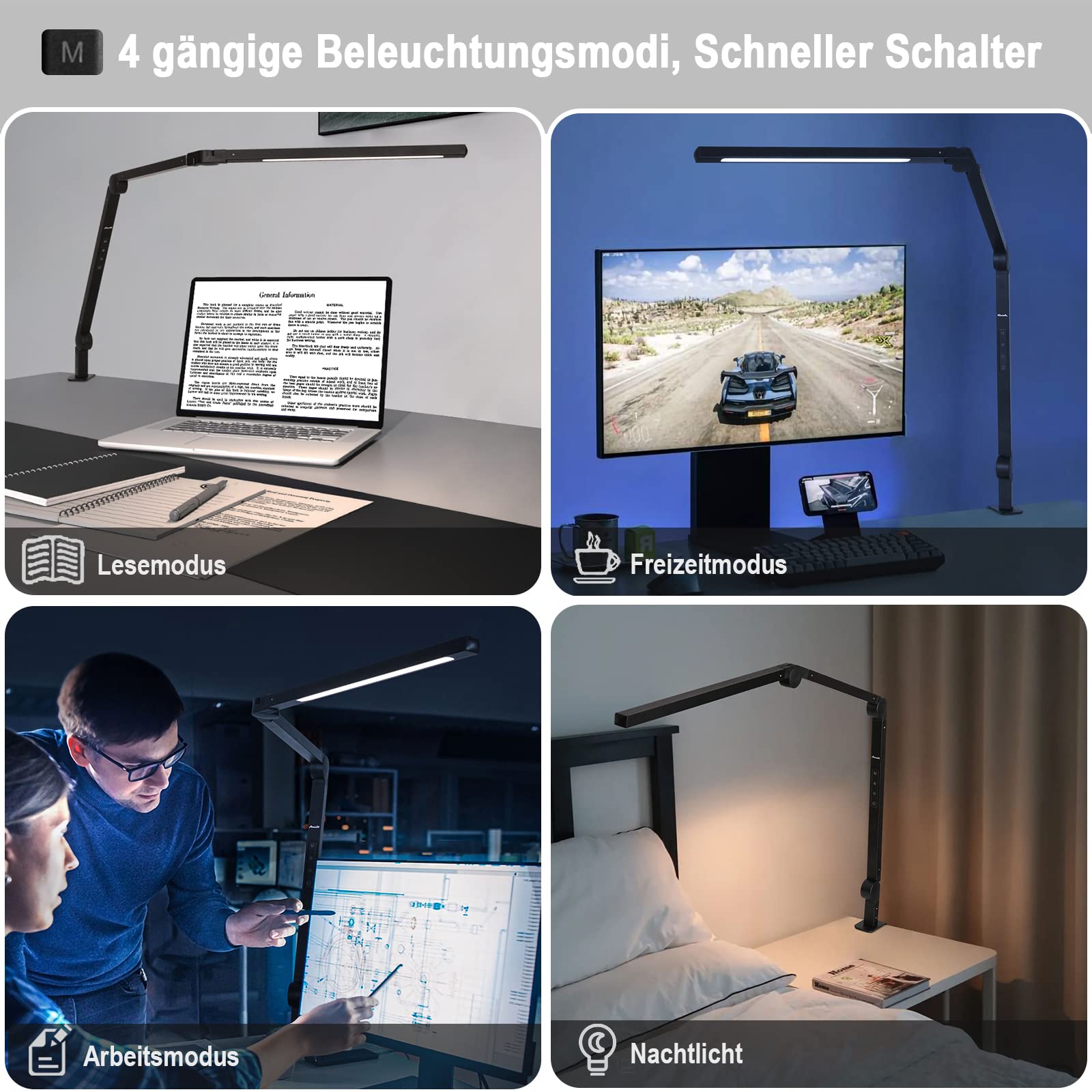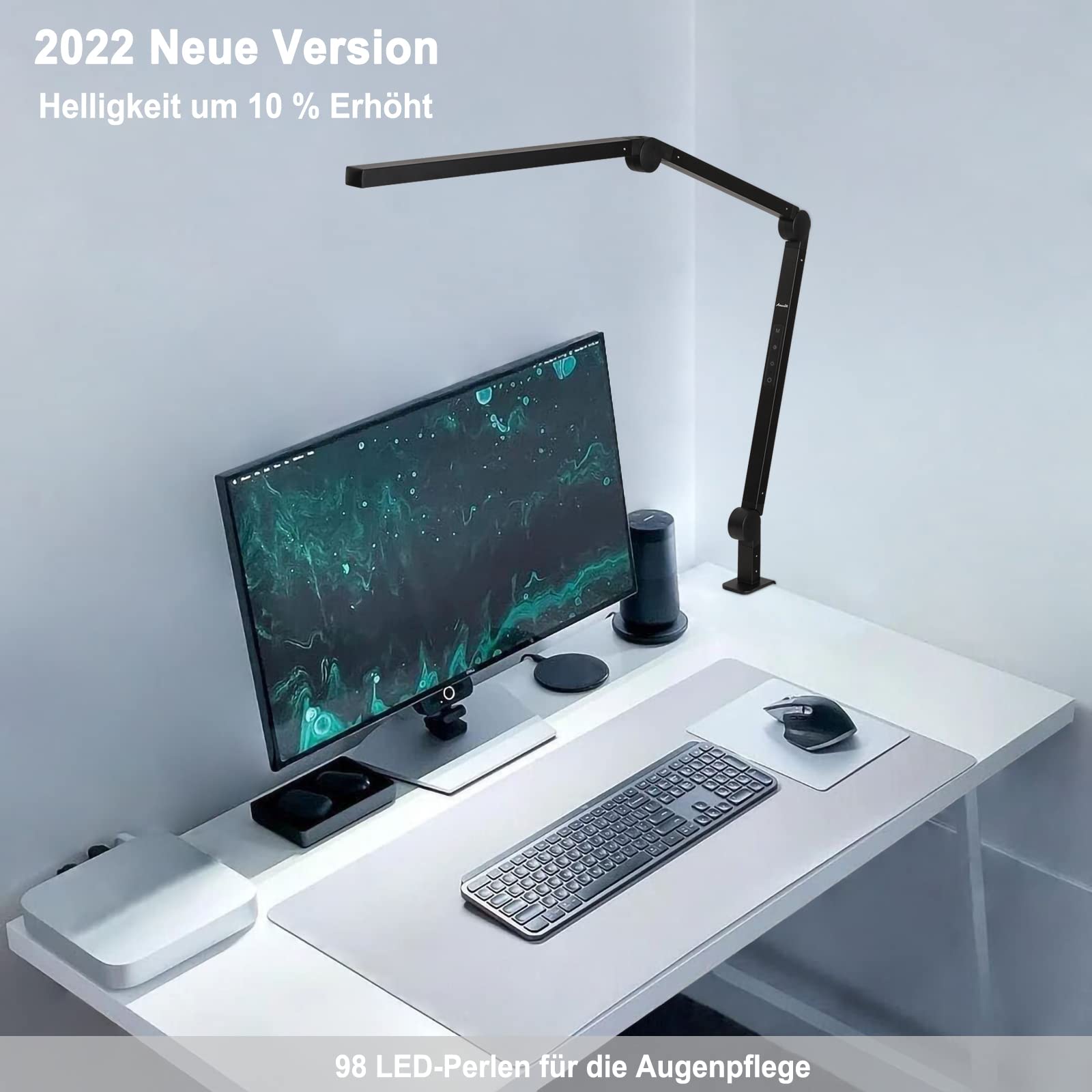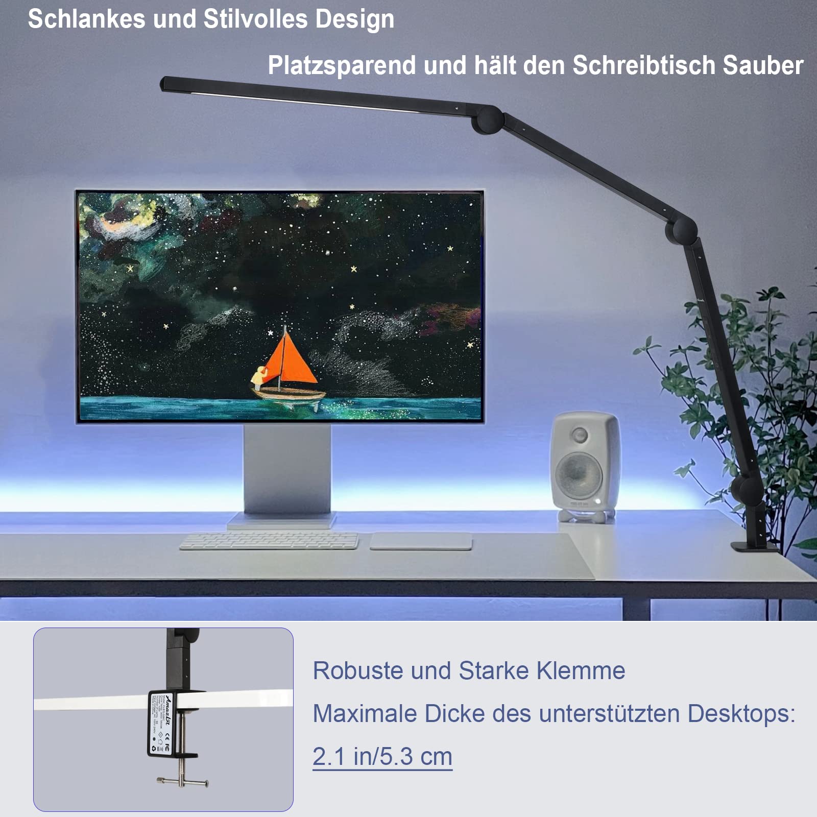 AmazLit lampa biurkowa LED, 10 W, ochrona oczu, zaciskowa, lampa stołowa, ramię wychylne, bezstopniowa regulacja przyciemniania i temperatury barwowej, do biura, domu, sterowanie dotykowe, timing