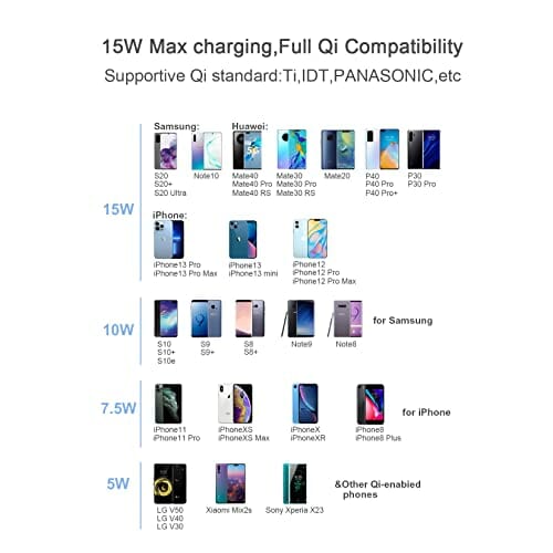 • Ulepszona i certyfikowana cewka miedziana Qi, zapewniająca szybsze ładowanie i większą moc: obsługuje bezprzewodowe systemy ładowania 15/10/7,5/5 W: tryb 15 W (z ładowarką QC2.0 lub QC3.0 12 V/2 A); tryb 7,5/10 W (z ładowarką QC2.0 lub QC2.0 3.0 przez 9 V/2 A); tryb 5 W (z ładowarką 5 V/2 A lub 5 V/2,4 A); kompatybilny ze wszystkimi urządzeniami Qi.