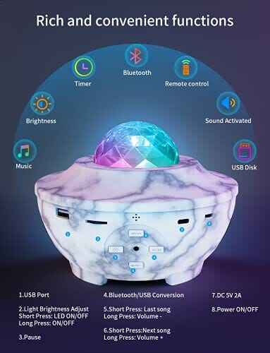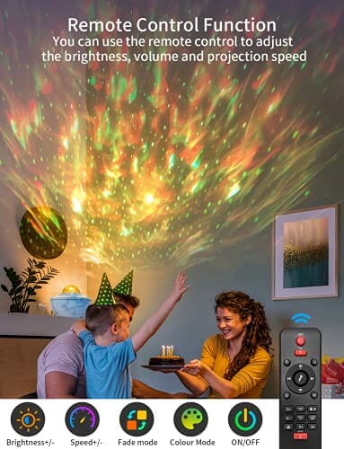 • Pilot zdalnego sterowania i funkcja timera: można łatwo zmienić tryby, aby dostosować styl imprezy za pomocą pilota zdalnego sterowania na podczerwień (zasięg: 12 m). Wybierz tryb projekcji gwiazd lub oba, zmień kolory / prędkość / jasność światła falistego, ustaw tryb muzyki, głośność / tryb aktywowany muzyką, ustaw timer 1h / 2h lub graj bez przerwy.