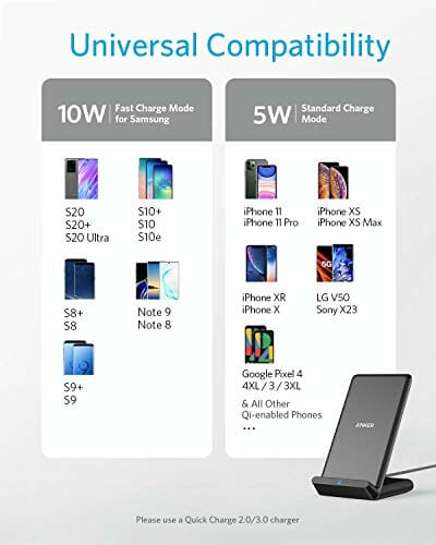 Anker PowerWave bezprzewodowa ładowarka stojąca 10 W, certyfikat Qi, kompatybilna z iPhone XR / XS / X / 8, technologia szybkiego ładowania do telefonów Samsung S9 / S8 itd., zasilacz nie wchodzi w za