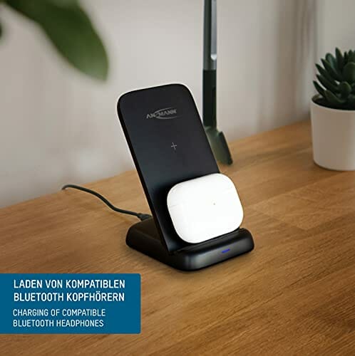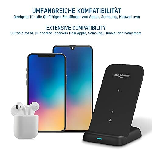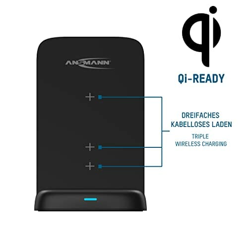 ANSMANN Bezprzewodowa ładowarka 15 W, z certyfikatem Qi, 3 szpule, stacja ładująca (pionowa, pozioma, słuchawki), funkcja szybkiego ładowania Samsung Galaxy S21/S20, Apple iPhone 13/12, AirPods