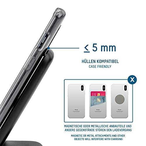 • Wskaźnik stanu LED: świeci dioda LED ładowarki, ładowanie smartfona. Po wyłączeniu urządzenie jest pełne, a ładowarka przełącza się na ładowanie podtrzymujące. Migająca dioda LED, może wystąpić błąd. Automatyczne wyłączanie bezprzewodowej stacji ładującej z ładowaniem podtrzymującym, zabezpieczeniem przed zwarciem i przeciążeniem