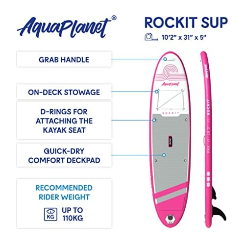 • Szukasz kajaka i deski w jednym? Rock it PNK firmy Aqua Planet jest wyposażony w poręczny zestaw do konwersji kajaków i lekkie dwukierunkowe wiosło. Zamień ze standardowego SUP na kajak z łatwością i ciesz się obydwoma stylami przesuwania się po wodzie.
