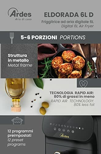 Ardes ARFRYA04 ELDORADA 6L D Heißluftfritteuse aus Metall 6 Liter Fassungsvermögen Luftfritteuse mit digitalem Touch-Display und 90 Minuten Timer Rapid Air Technologie