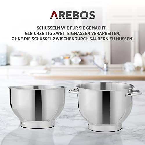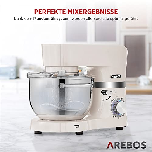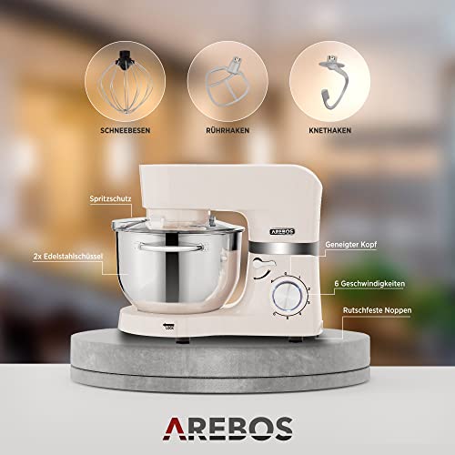 Arebos Profesjonalny robot cukierniczy 1500W | Krem | Wielofunkcyjny robot kuchenny z trzepaczką, ubijaczką i haczykiem | Z 2 miskami ze stali nierdzewnej | 6 prędkości | Funkcja impulsu
