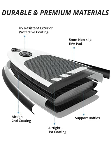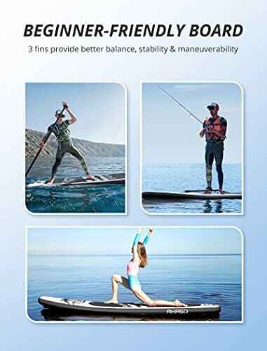 • Ultralekka – deska do paddleboardingu AKASO wykonana jest z dwuwarstwowego materiału PCW klasy wojskowej z rdzeniem o wysokiej gęstości, co zapewnia nadmuchiwanej desce SUP wystarczającą ochronę przed kolizjami i amortyzacją. Maksymalna pojemność wynosi do 150 kg i może wytrzymać nawet zgniecenie pickupa. Waga 7,8 kg (20% lżejsza od innych) pozwala dorosłemu mężczyźnie łatwo podnieść ją nad głowę.