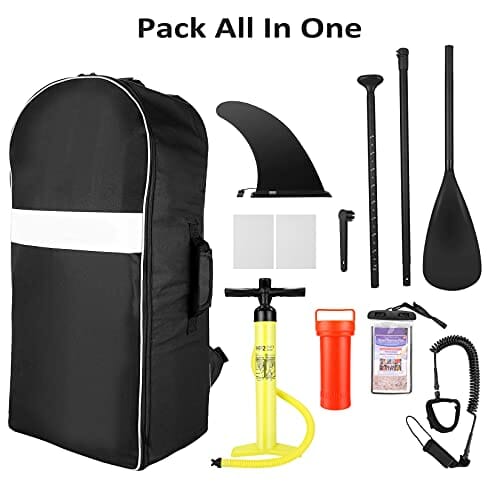 • Zakres dostawy: nadmuchiwana deska SUP, regulowane wiosło z 3 składników, rozkładany miecz środkowy, plecak, podwójna pompka, pasek na kostkę, wodoszczelny zestaw naprawczy do torby
