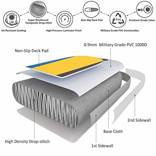 • Bardzo trwały: Wykonane z cienkiego, wojskowego PCW o grubości 0,9 mm i składa się z niezliczonej konstrukcji Drop-Stitich. Dzięki temu deska zachowuje solidną i niezawodną formę. W takim razie nie wygina się i nie uszkadza się.