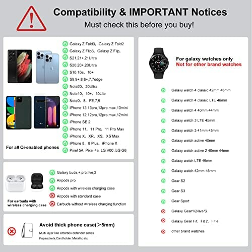 • 【Dobry towarzysz serii Samsung】 Bezprzewodowe stacje ładujące nadają się głównie do serii Samsung. Smartwatch – Samsung Galaxy Watch 4/3/1, Samsung Galaxy Watch Active 2/1, Samsung Gear S2/S3/S4/Sport. ładowarka do telefonu jest kompatybilna z Samsung Galaxy S21 Ultra, Galaxy S21, S20 ultra/S20 5G/S20+/S10/S10+/Note 20 Ultra 5G/Note 10+/10/9/8 Samsung Galaxy Z Fold 3/flip 3 itd. Ładowanie stacji dokującej kompatybilne z Samsung Galaxy Buds +/Buds Pro itd.