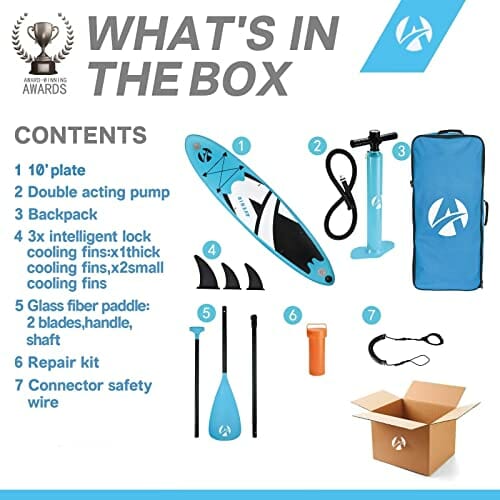 - Części w zestawie: Inteligentna blokada żeber chłodzących ×3, Plecak ×1, Pompa dwustronnego działania ×1, Przewód zabezpieczający złącze ×1, Płyta 10′ ×1, Wiosło z włók