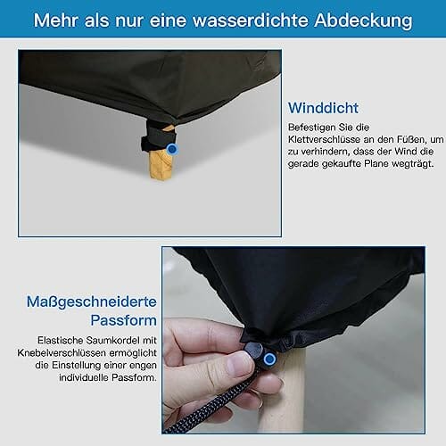 Wiatroszczelna i indywidualnie: Wiatroszczelna i indywidualnie dopasowana: dolne zapięcia zatrzaskowe zabezpieczają osłonę w wietrzne dni. Sznurki zapewniają lepsze osadzenie pokrowca na meble.