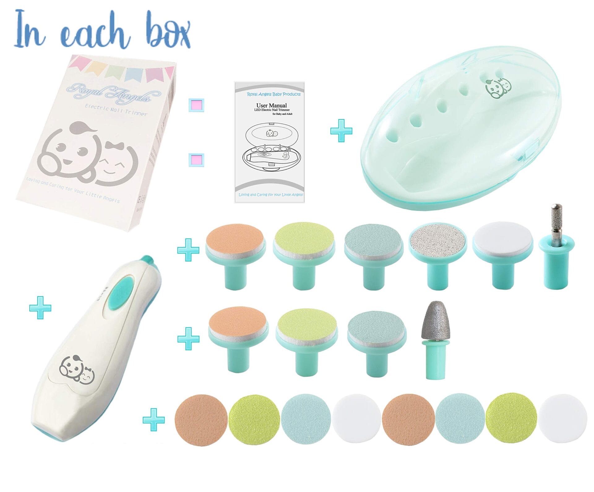 Obcinacz do paznokci dla dzieci 21 w 1, z oznakowanym etui, zawiera 13 dodatkowych narzędzi, elektryczny zestaw do paznokci Royal Angels Baby, obcinacz do paznokci u noworodków i rąk (zielony)