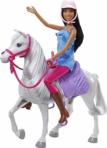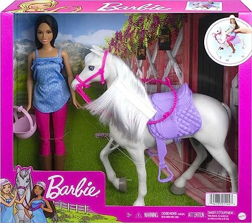 Ten wyjątkowy zestaw Barbie HCJ53 to idealny prezent dla dzieci w wieku od 3 do 7 lat. Zestaw zawiera lalkę brunetkę o wysokości 29 cm, konika z siodłem, uzdą, lejcami i toczkiem.