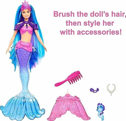 Ta wyjątkowa lalka Barbie zapewni Twojemu dziecku wiele godzin zabawy. Dzięki wymienialnym płetwom i szczotce do włosów Twoje dziecko będzie mogło stworzyć wyjątkowy wygląd swojej lalki. Dodatkowo, lalka ma wiele akcesoriów, które pozwolą Twojemu dziecku wyobrazić sobie, że jest syrenką.