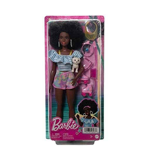 Barbie Lalka z fryzurą w stylu afro, wrotkami, modnym strojem, akcesoriami i zwierzątkiem, HPL77