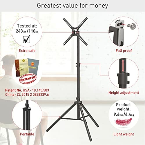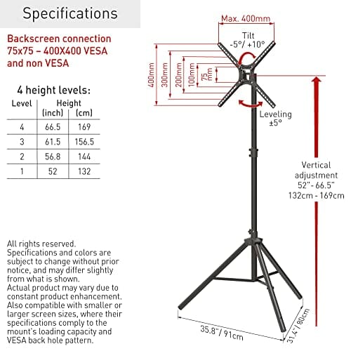 • ► Funkcjonalność – stojak pod telewizor można pochylić o 10 stopni w górę i w dół. Regulacja wysokości od 132 cm do 168 cm, aby zapewnić optyczny kąt widzenia.