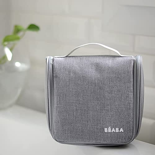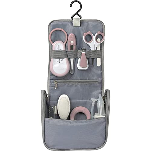 BÉABA – Kosmetyczka dla niemowląt w podróży – 9 części w zestawie: termometr kąpielowy termometr cyfrowy gryzak masażer dziąseł przyssawka do nosa – brudny róż