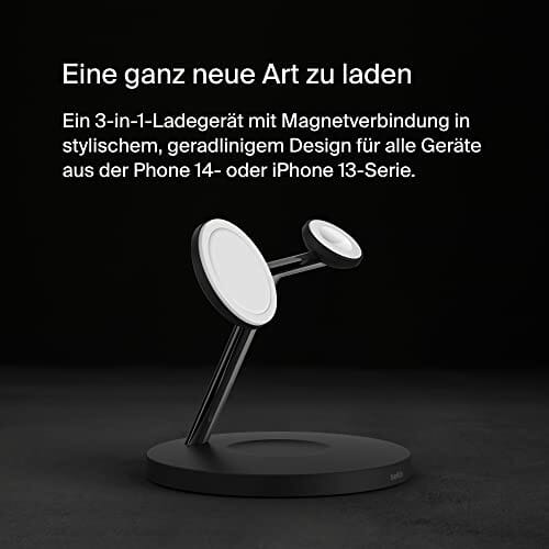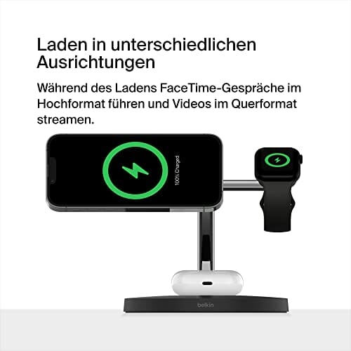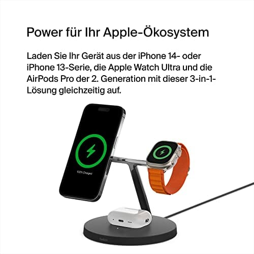 Belkin MagSafe bezprzewodowa ładowarka 3 w 1, szybkie ładowanie o mocy 15 W dla iPhone’a i Apple Watch, stacja ładująca do AirPods, iPhone’a 14/14 Plus, 13, Pro, Pro Max, Mini, i Apple Watch – czarna