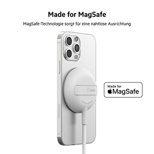 Belkin Przenośna bezprzewodowa podkładka ładująca z MagSafe (szybkie ładowanie do 15 W, podpórka, zgodność z urządzeniami iPhone 14, iPhone 13 i iPhone 12, brak zasilacza w zestawie) – biała