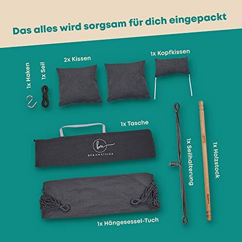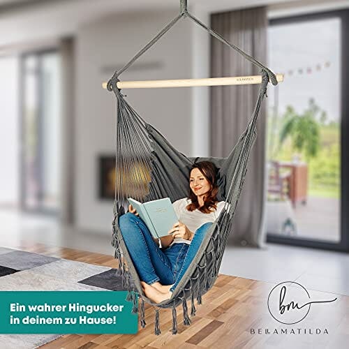 • Fotel wiszący firmy BELLAMATILDA odpoczywasz zawsze i gdzie chcesz. Niezależnie od tego, czy po pracy w domu z książką, w weekend w ogrodzie ze zwierzakiem lub na wakacjach na kempingu z chłodnym napojem. Fotel wiszący z praktyczną kieszenią wewnętrzną i piękną, dużą poduszką to idealne miejsce dla całej rodziny i wyczaruje uśmiech na twarzy.