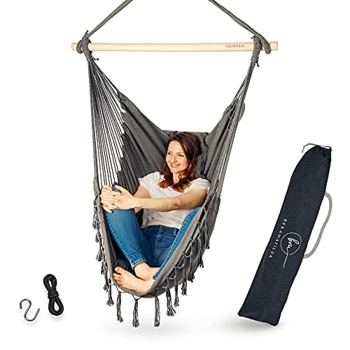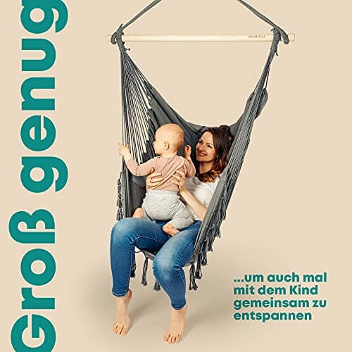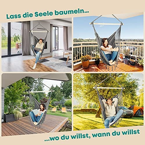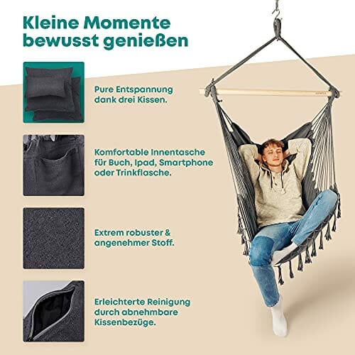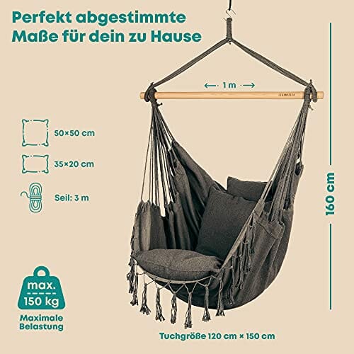 • Używaj tanich materiałów i zbyt cienkich drewnianych drążków, które łamią się podczas siedzenia i nie chcesz polegać. Dlatego stawiamy na bardzo grube i stabilne drewniane drążki oraz wytrzymałe, łatwe do prania materiały, które bez problemu wytrzymują 150 kg, dzięki czemu możesz w pełni zrelaksować się spędzając czas na hamaku.