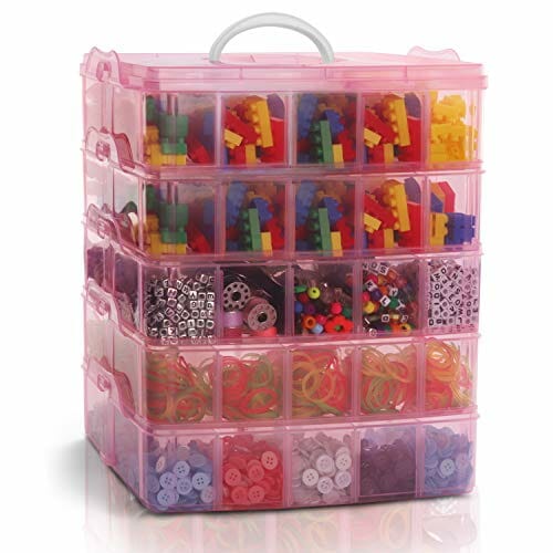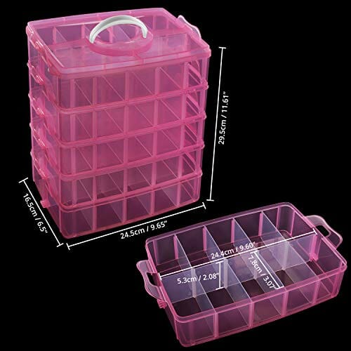 Belle Vous 5-Poziomowy Różowy Przezroczysty Plastikowy Pojemnik do Piętrowego Układania – Regulowane Podziałki – Maks 50 Przegródek – Pojemnik na Zabawki, Biżuterię, Koraliki, Akcesoria, Narzędzia