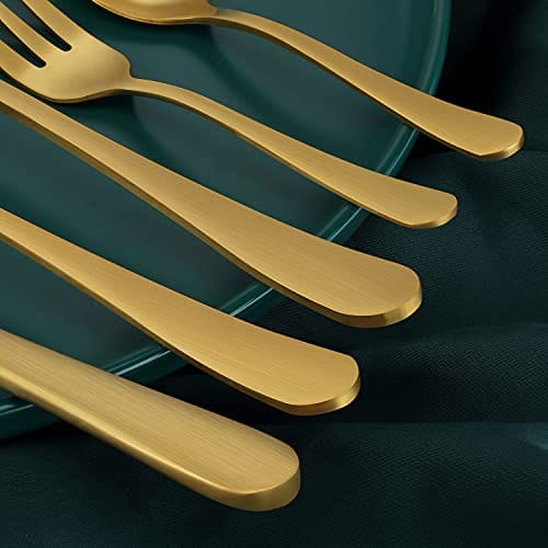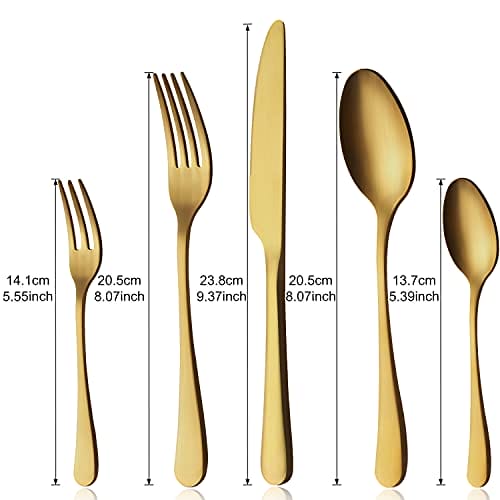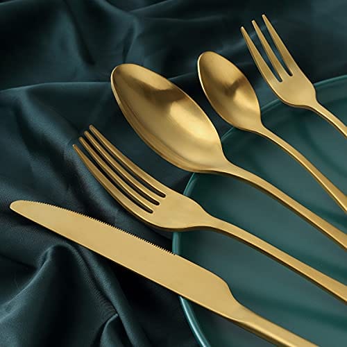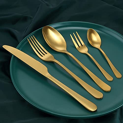 【Zdrowie i trwałość】Zestaw: 【Zdrowie i trwałość】Zestaw sztućców z matowego złota jest wykonany z wysokiej jakości stali nierdzewnej przeznaczonej do kontaktu z żywnością, wykutej z jednego kawałka, co zapewnia zdrowie i trwałość, jest nietoksyczny, nie zawiera niklu, odporny na korozję.