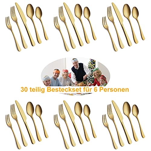 Zestaw sztućców BEWOS dla 6 osób, 30-częściowy zestaw sztućców z matowego złota, w tym naczynia ze stali nierdzewnej, takie jak noże, widelce, łyżki itp, można myć w zmywarce (matowe złoto)