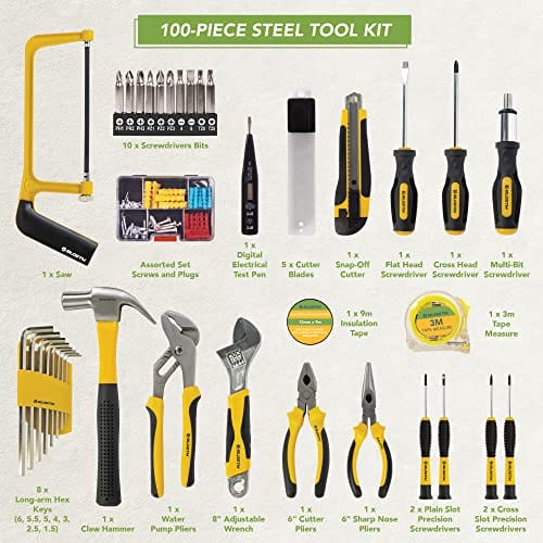 BLOSTM 100-Częściowy Zestaw Narzędzi – Kompletny Zestaw z Niezbędnymi Narzędziami Ręcznymi Do Projektów DIY, Napraw Domowych, Konserwacji Samochodu –