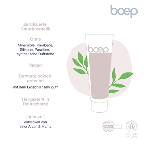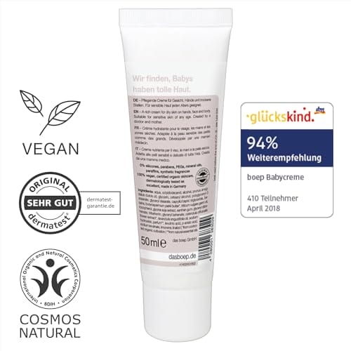 • Wegański i naturalny: Przywiązujemy wagę do dobrych składników! Dzięki temu nasz krem dla niemowląt boep do suchej skóry jest wegański, certyfikowany przez COSMOS NATURAL oraz przetestowany dermatologicznie z wynikiem „bardzo dobry”. Nie zawiera olejów mineralnych, parabenów, silikonów, parafin i PEG.