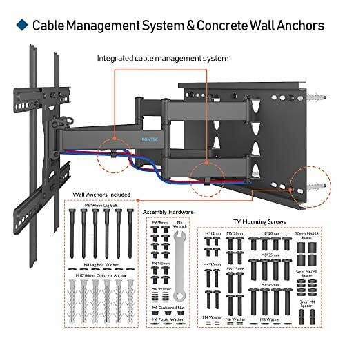 • System zarządzania kablami – Uchwyt ścienny TV posiada zintegrowany system zarządzania kablami, który pozwala ukryć nieestetyczne kable, dzięki czemu miejsce oglądania jest czyste i uporządkowane. W komplecie znajduje się ilustrowana instrukcja, poziomica, kotwa do ściany betonowej oraz wszystkie niezbędne elementy wyposażenia produktu.