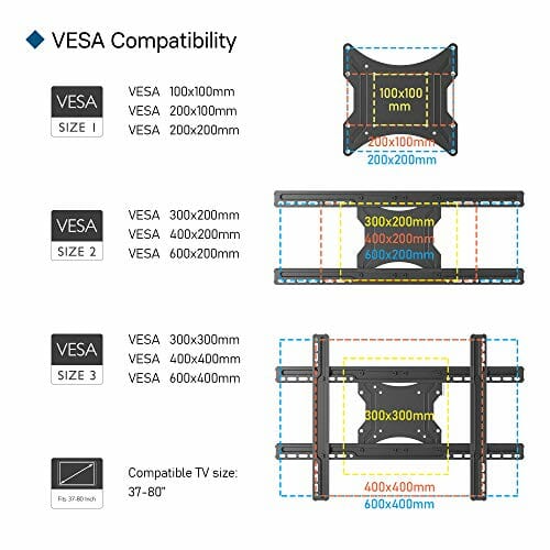 • TV COMPATIBILITY – Uchwyt ścienny TV jest odpowiedni dla większości 37″-80″ płaskich telewizorów LED, Plazma, LCD z wzorami VESA 100×100 200×200 300×300 400×200 400×400 600x400mm. Uchwyt ścienny do telewizora jest kompatybilny ze wszystkimi markami, o ile są one zgodne z VESA. ZMIERZ ROZSTAW OTWORÓW ZA TELEWIZOREM I UPEWNIJ SIĘ, ŻE OBSŁUGUJE ON STANDARD VESA.