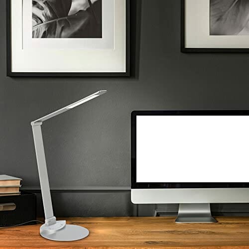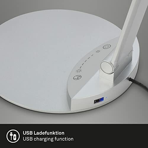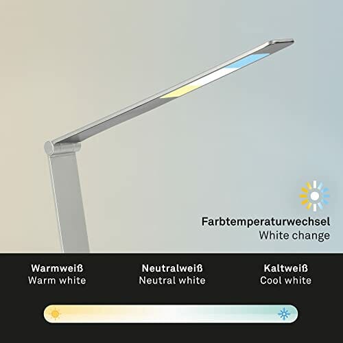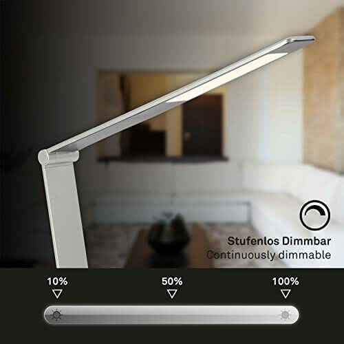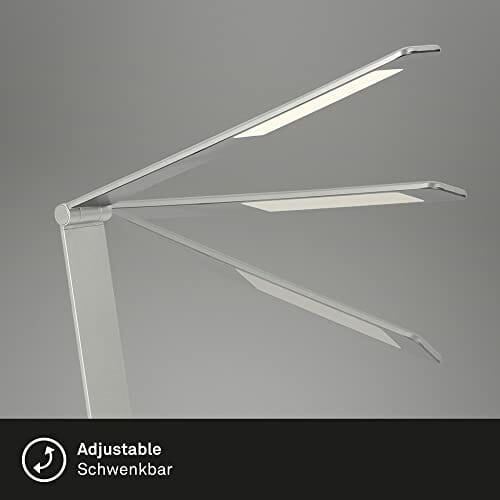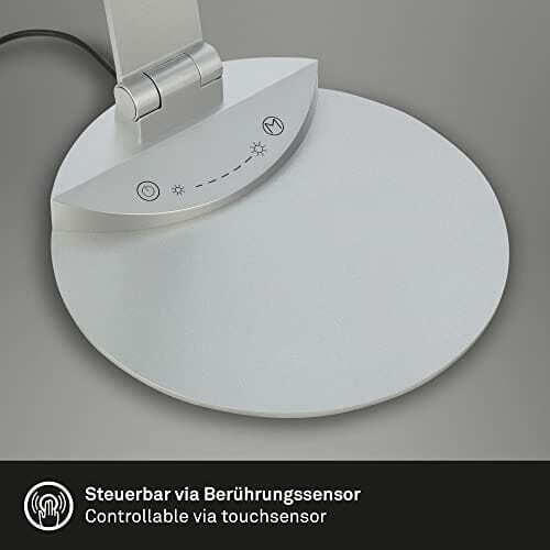 • Jasność tej lampy biurkowej LED można regulować w 7 krokach. Wszystkie funkcje można wybierać za pomocą funkcji dotykowych. Ta obrotowa lampa biurowa w srebrnym kolorze jest zasilana za pomocą kabla podłączonego do gniazdka. Podstawa jest bardzo płaska i solidna, co zapewnia bezpieczną pozycję.