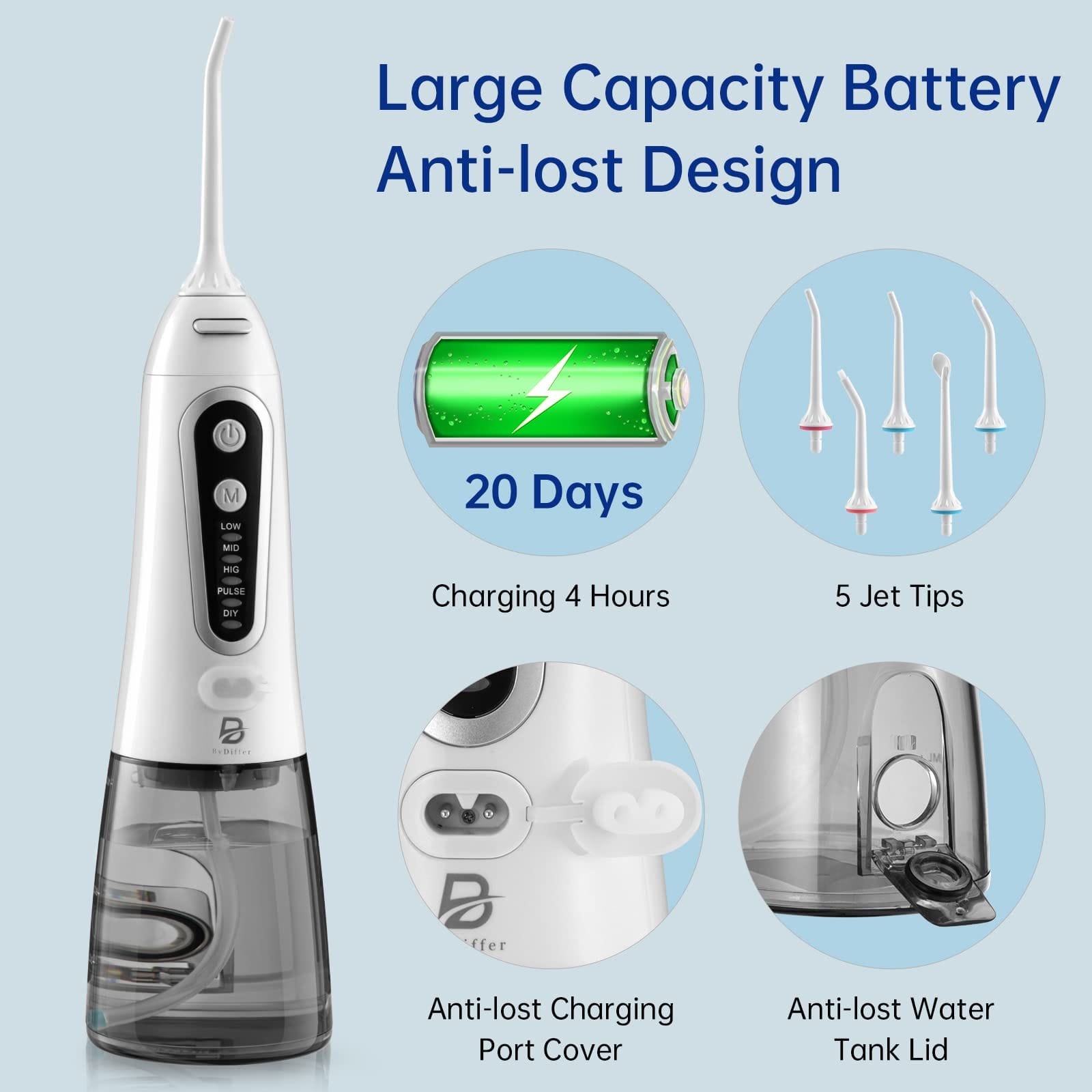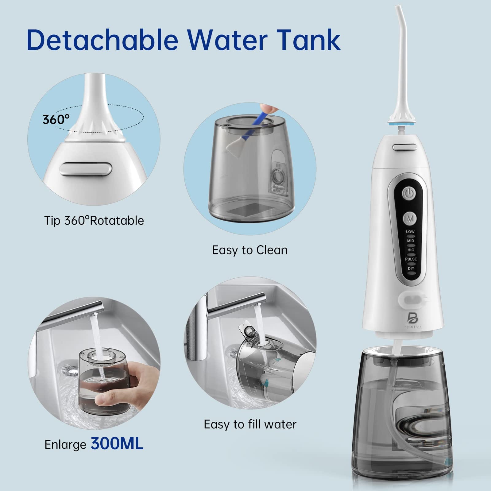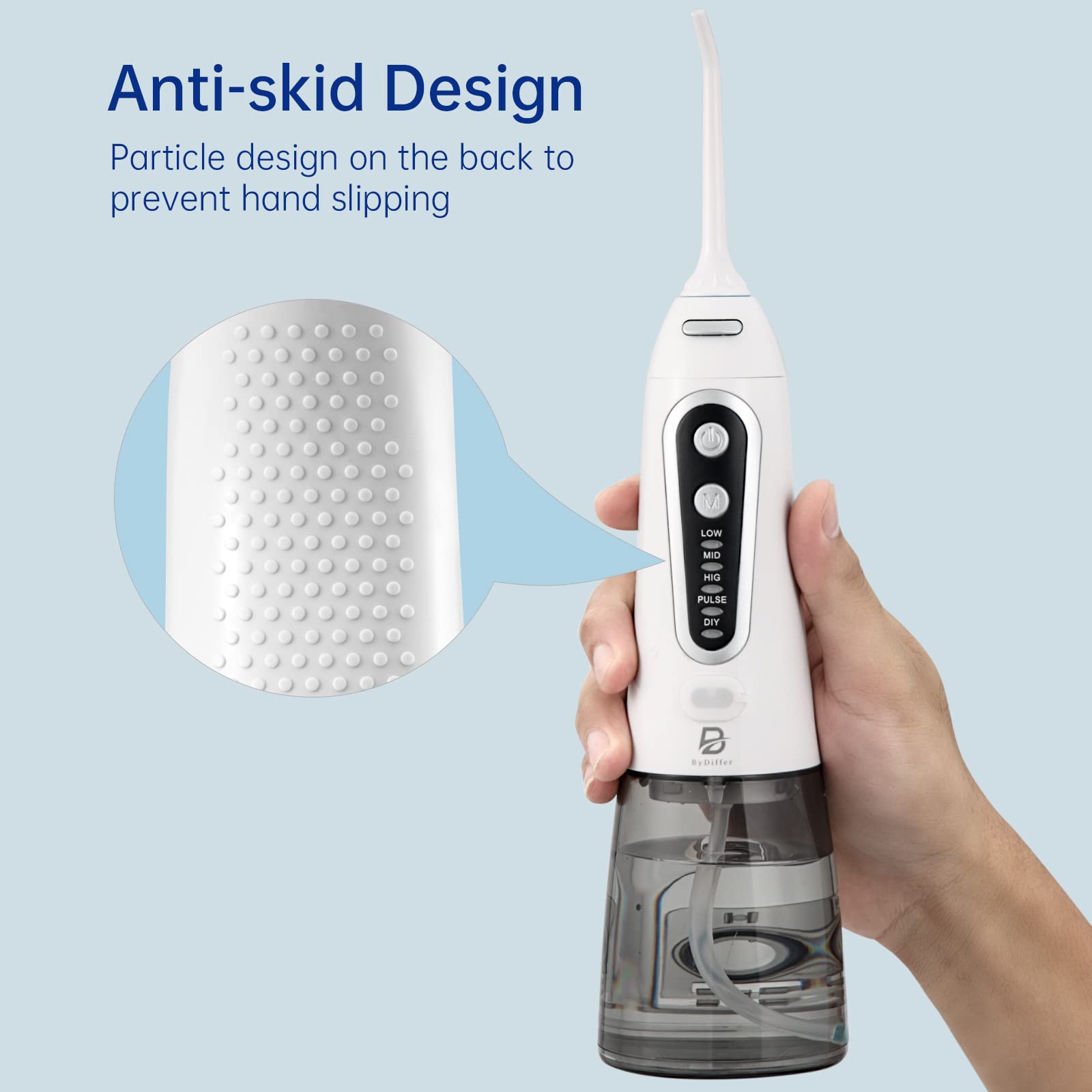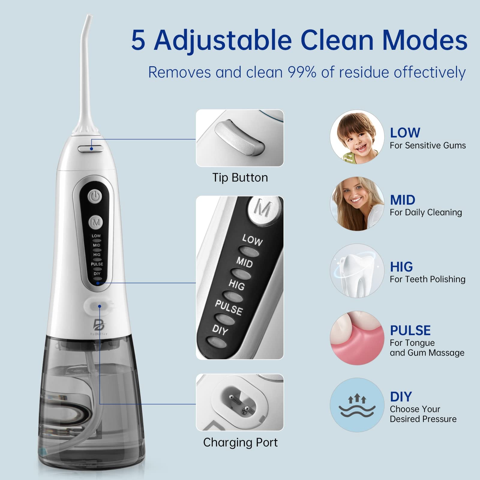 • 【Twój własny tryb DIY】 Bezprzewodowa szczoteczka do zębów ByDiffer jest wyposażona w dostosowany tryb DIY, który pozwala łatwo dostosować się do najbardziej wygodnego ciśnienia wody (30-120PSI). Nadaje się do wrażliwych zębów, pomaga również przy krwawieniu dziąseł, nieświeżym oddechu, korzystny przy pielęgnacji aparatów ortodontycznych i mostów.