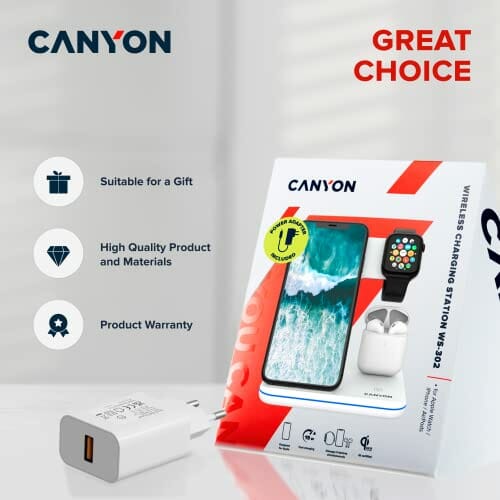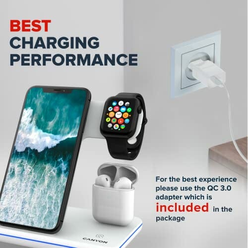 Canyon WCS302W bezprzewodowa stacja ładująca 3 w 1 dla urządzeń Qi, Apple Watch, iPhone, Samsung Galaxy, Note, Airpods – szybka bezprzewodowa ładowarka indukcyjna 21W – biała