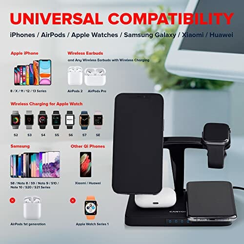 • ✅ Szeroka kompatybilność: bezprzewodowa stacja dokująca 4 w 1, kompatybilna z iPhone 14/ 14 Pro / 14 Pro Max/13 / 13 mini / 13 Pro / 13 Pro Max 12 / 12 Pro / 12 Pro Max / 11 Pro / 11 Pro Max / XS / XS Max / XR / 8 Plus / Samsung Galaxy S22 / S22 / Ultra/ S2 1/ S21+ / S21 Ultra/ S21 Plus/ S20 FE/S20/S10/S10 Plus/S9+/S9/S8/S8+ i wszystkie telefony obsługujące technologię Qi. Bezprzewodowa stacja ładująca do Apple Watch Series 6/5/4/3/2/SE, Airpods 3/2/Pro(Górna magnetyczna ładowarka jednostkowa obsługuje tylko iPhone 12-14 Pro Max i wyższe z/bez oryginalnego etui MagSafe. Dolna ładowarka obsługuje wszystkie telefony z obsługą QI, w tym Iphone 8 i wyższe).
