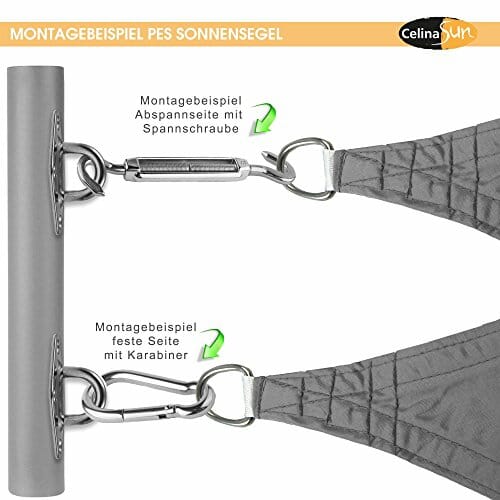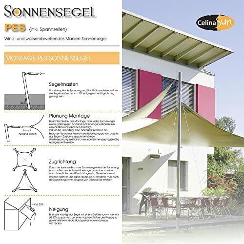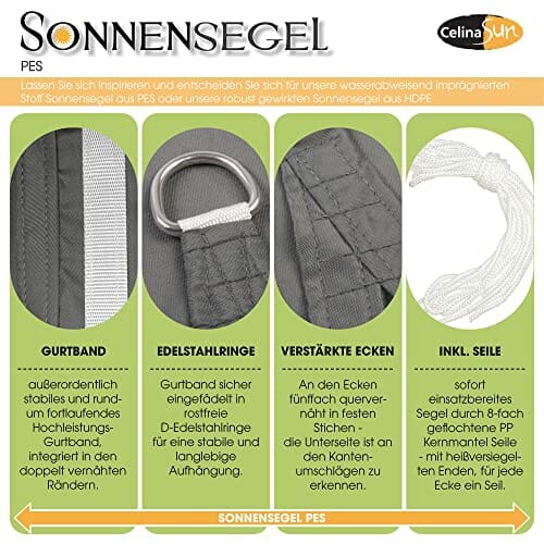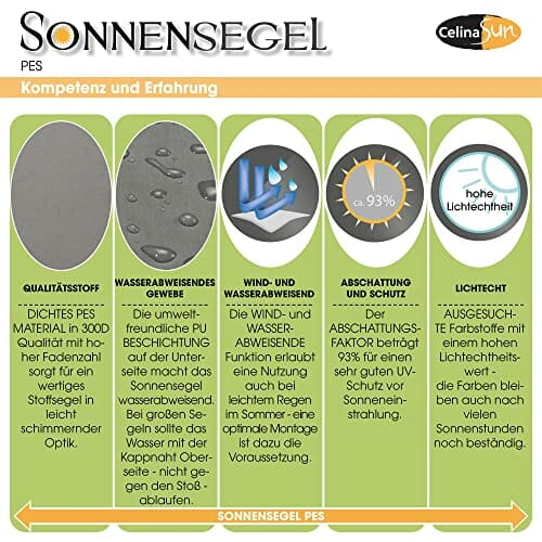- CelinaSun Premium PES Sonnensegel / Sonnenschutz wasserabweisend. Das robuste Segel lässt sich einfach und schnell montieren. Zur Befestigung sind an den Ecken Edelstahlösen angebracht, diese wurden für eine hervorragende Stabilität extra 5-fach quer vernäht. Durch die konkave Form wird die Spannung nach außen übertragen. Zusätzliche Widerstandsfähigkeit erhält das Segeltuch durch das belastbare, rundum durchgängig eingenähte Gurtband