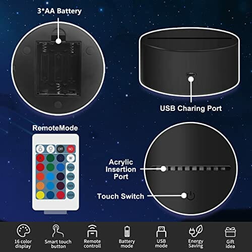 • Łatwa w użyciu: Wystarczy umieścić płytkę akrylową w podstawie, a następnie podłączyć kabel USB do zasilania / komputera lub umieścić w niej 3 baterie AA (nie są dołączone). Lampki nocne 3D są wykonane z wysokiej jakości akrylu.