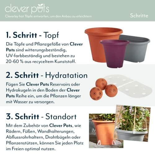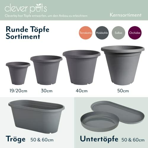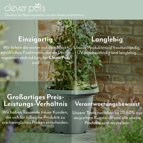 • Trwały – Wykonany w 30% z tworzywa sztucznego pochodzącego z recyklingu i nadaje się do recyklingClever Pots są dostępne w 2 kolorach rdzeniowych; terakota, węgiel drzewny oraz 2 kolorach dekoracyjnych; szałwia i storczyk tylko do doniczek 20 cm