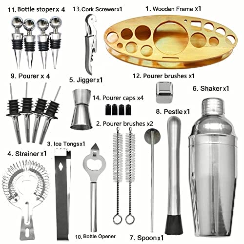 AYAOQIANG Cocktail Making Set Cocktail Shaker Set 750ml Stainless Steel Bar Tool Set Bartender Kit with Display Stand to zestaw barmański, który zapewni Ci wszystko, czego potrzebujesz do przygotowania doskonałych koktajli. Wykonany ze stali nierdzewnej o pojemności 750 ml, shaker zapewnia trwałość i niezawodność. Ten kompletny zestaw zawiera również narzędzia barmańskie, takie jak miarka, muddler, sitko i wiele innych, abyś mógł tworzyć różnorodne i smakowite drinki. Wygodny stojak na zestaw pozwoli Ci zachować porządek i mieć wszystko pod ręką. AYAOQIANG Cocktail Making Set to idealny wybór dla każdego pasjonata barmaństwa.