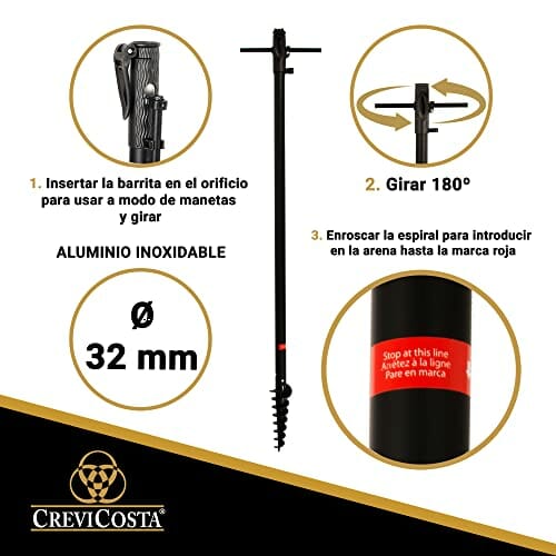 Einzelheiten: Praktisches, funktionales und aktualisiertes Pfosten-Design. Funktioniert wie folgt: 1. Das Metallrohr abziehen und in das dafür vorgesehene Loch stecken, so dass es in Kreuzform bleibt, um die Hände stützen und die Spirale einschrauben zu können. 2. Drehen Sie es mit den Händen, indem Sie die Spirale bis zu den Punkt einführen, der durch die rote Lasche am unteren Pfosten befestigt ist. 3. Jetzt den Pfostenteil anbringen, der dem Sonnenschirm entspricht. Die Strecke ist total, so dass Sie den Schirm nach Ihrem Geschmack oder Ihren Schattenbedarf jederzeit heruntersenken. Gestell: sehr hochwertiges Aluminium getönt schwarz rostfrei Dank dessen können wir hervorheben, dass unsere Produkte robust und leicht sind. Verfügt über 16 Fiberglasstäbe, die sehr winddicht sind. 145 g/m2 300D Polyestergewebe mit Silberbeschichtung, verleiht unseren Produkten eine elegante Haptik und Optik. Vollständiger Schutz UPF100 vor UV-Strahlen, zugeordnet.