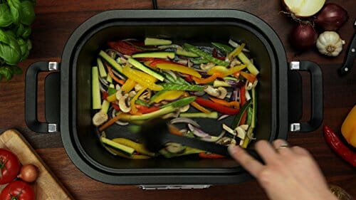 Einzelheiten: Dieser Crock-Pot Multikocher mit 5, 6 Liter Fassungsvermögen ist für 6 bis 7 Personen geeignet. Er bietet die Funktionen Braten, Bräunen, Dämpfen, Anbraten, Schongaren und Reis garen. Verstellbare Temperatur- und Timerschalter sowie vorprogrammierte Einstellungen. Mit Rezeptbuch.