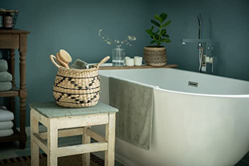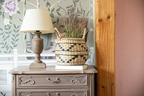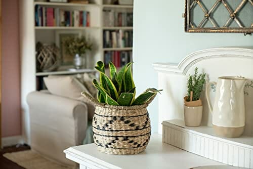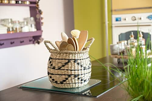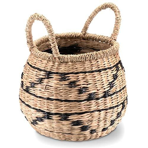 Decorasian Kosz dekoracyjny, pleciony z trawy morskiej z wzorem etnicznym – dekoracyjny kosz łykowy z uchwytem – ozdobna doniczka na parapet